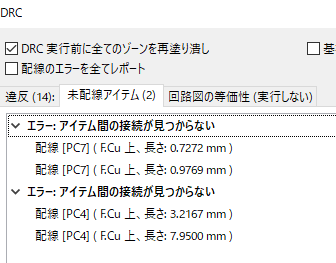 この手のミスは、以下のように見た目でもわかりますし、発注前にKiCADの「デザインルールチェッカー」を実行すればすぐに気付くことが出来るので、気づけなかったことが悔しいです。